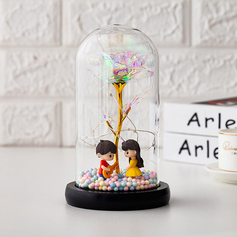 Galaxy Rose consists of colorful glass roses, LED light strings, a wooden base and tough glass dome.